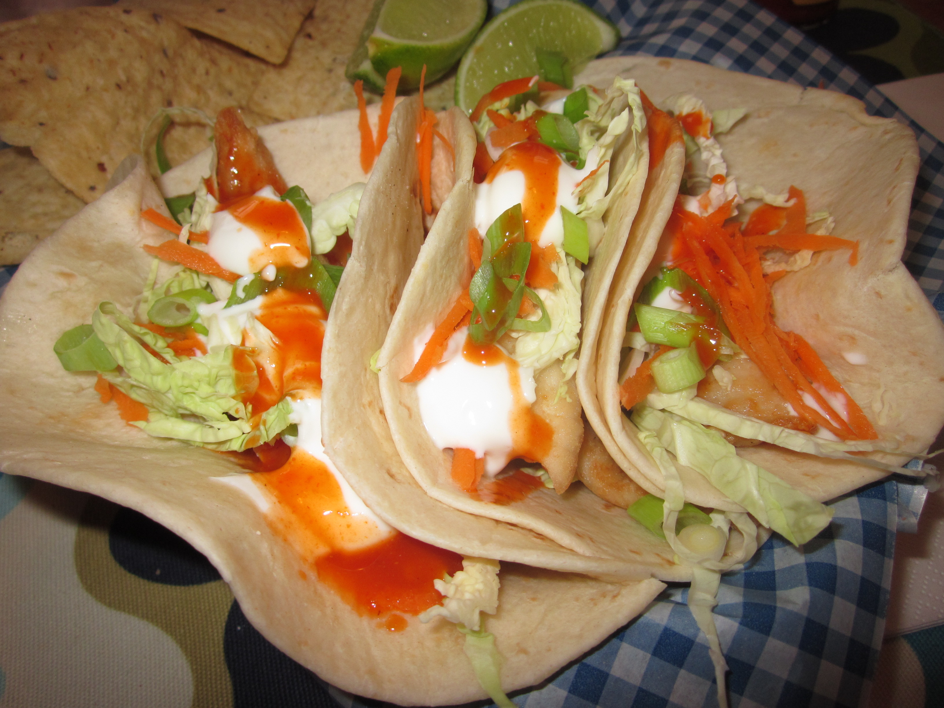- 2 small Tilapia filets sliced into 3″ x 1″ chunks dredged in salt and peppered flour. Pan fry in just a little canola to give a light crust. Drain on paper towels.