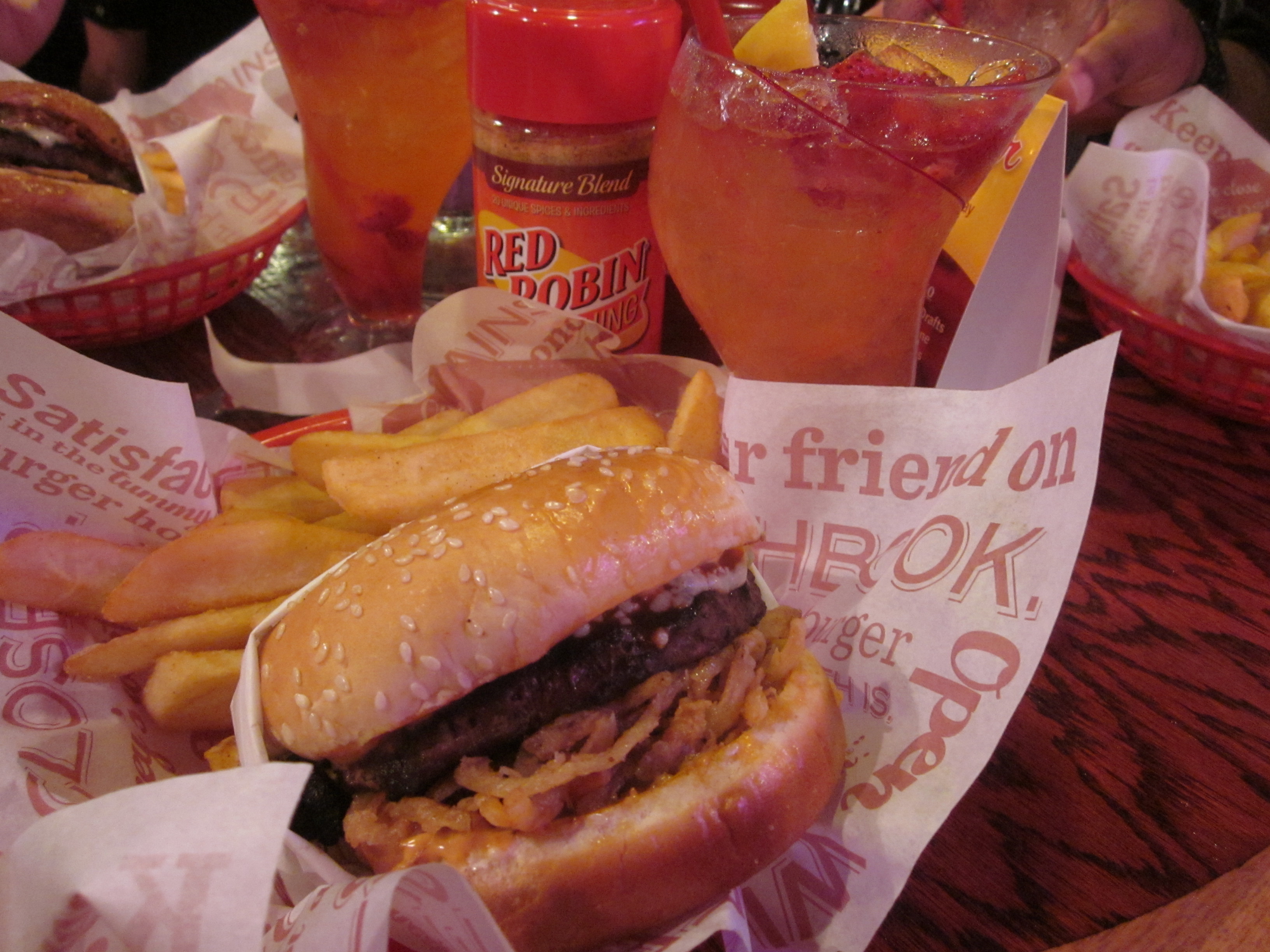 while trying to make us jealous for making it to Red Robin before us, a friend got out to snap a photo on foursquare of the coming soon Winter Garden Village location. While he was doing that, the manager came out and said friend played up his excitement about the soon to be open restaurant garnering an invitation to the soft opening which he graciously invited us to join them-true story. Well, tonight was the night. Se we dashed across town to do a little shopping en route (World Market) and arrived about 6:40. We were ushered right in with a bit of lecturing about what we could have free, bottomless beverages, burgers and one entree per table and one milkshake per table. Servers and other staff were really attentive and friendly and didn’t seem flustered or stressed out, which is a good sign. We ordered bottomless freckled lemonades (lemonade with strawberries and syrup) and I ordered my usual, blue ribbon burger, no pink, no lettuce, no tomato, swap the onion bun for sesame and sat back to wait! Things came out quickly and accurately. My burger was still a bit pink (ideal) in the center and not to goopy. Three burgers, one order of fish and chips, three freckled lemonades, one diet coke, and a cookie magic milkshake for free. Nice work if you can get it.