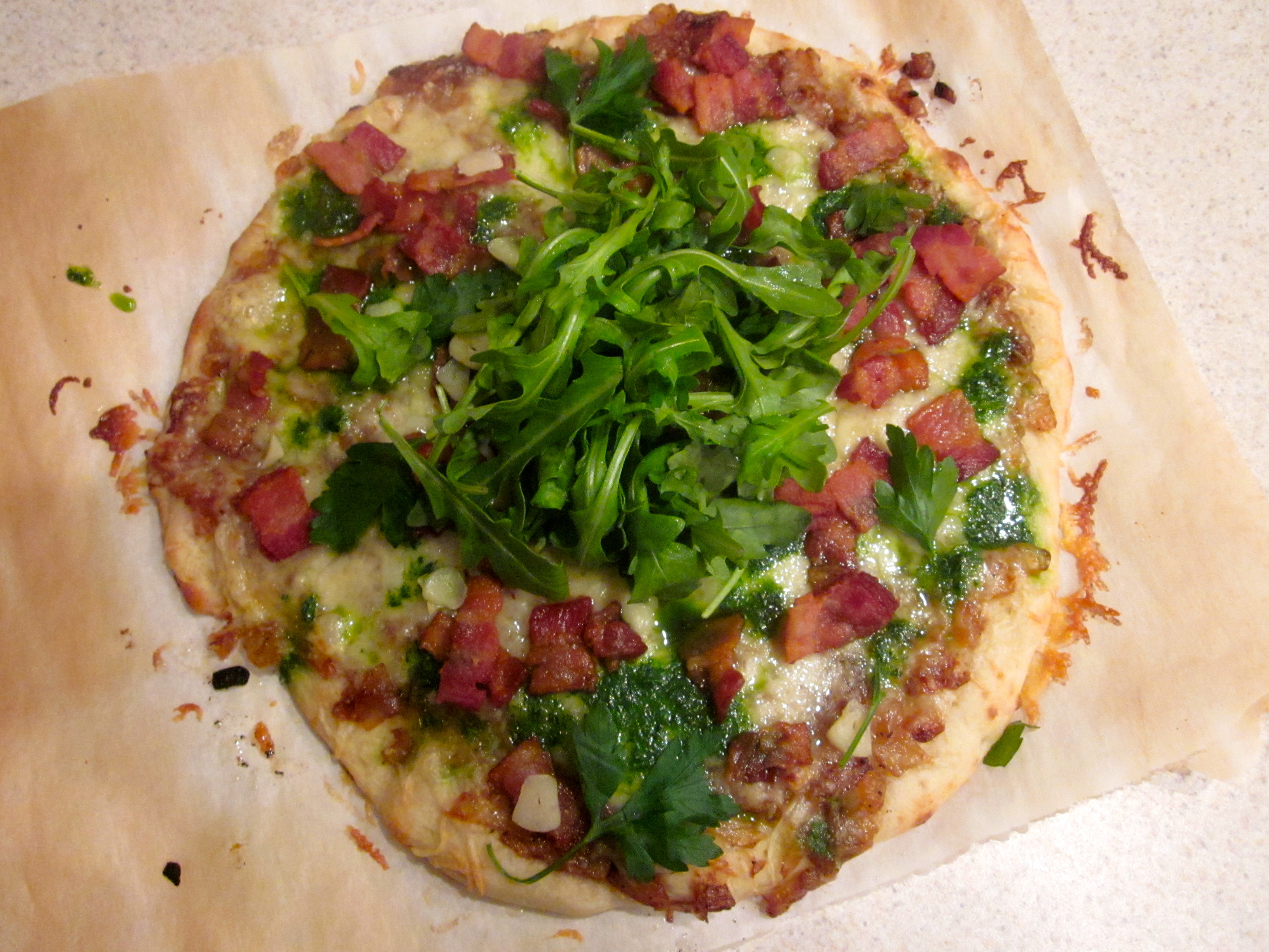 Bobby Flay never fails to deliver. We tweaked a pizza recipe out of Bar American for a caramelized onion, gruyere, garlic oil and bacon pizza by using a Stonefire brand flatbread crust. The rest of the recipe was fairly involved with cheffy steps so we opted for the flatbread premade for ease of actually eating at a reasonable hour. I have to say that we really enjoy the two Stonefire products available to us here in central Florida. Onions caramelize for 45 minutes down to a consistently that is almost saucelike and substitute as such for the base of the pizza. Smothering with gruyere and then sprinkling bacon lardons, garlic chips, and parsley oil over the top creates a great take on home baked pizza.We piled on arugula to round it out as a dinner and ate it all with a knife and fork.