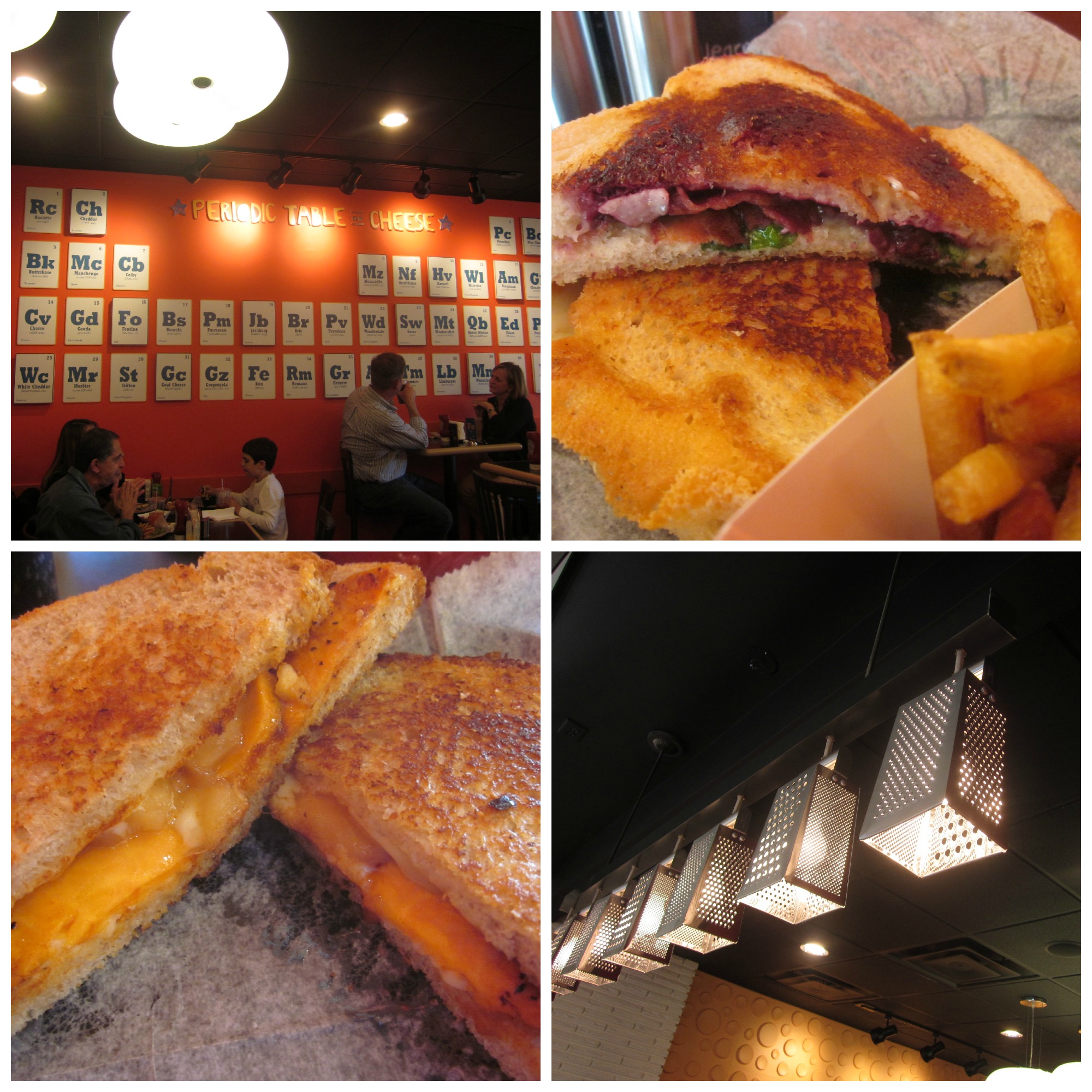 while it might feel like every meal we eat is outside of our house, that wouldn’t really be true. Z has often commented that I should write about the everyday, the failures, the bland and the boring. I do feel that as a general rule we are eating pretty well, both at home and outside of it. We cook good food (most of the time) and eat at a fairly high level. I will also say I’m not above a hot dog or McDonalds because that would be a lie. All that said, we all love a good grilled cheese sandwich and I have kind of lamented the fact that there isn’t a grilled cheese place here in town. Ah, but now there is. Toasted opened recently in the Winter Park (where else) area and sports a menu filled with grilled cheeses of all sorts (except a Wonder bread and Kraft Single) so we stopped in one night for dinner. It is a cute place with nice cute decor, a swiss-cheesy treatment on the left side wall and a periodic table of cheese on the right wall. It does make me wonder if the designer who made the periodic table even likes cheese as they spelled Manchego (Manchengo!?) wrong. I love me some good spelling (and grammar.)