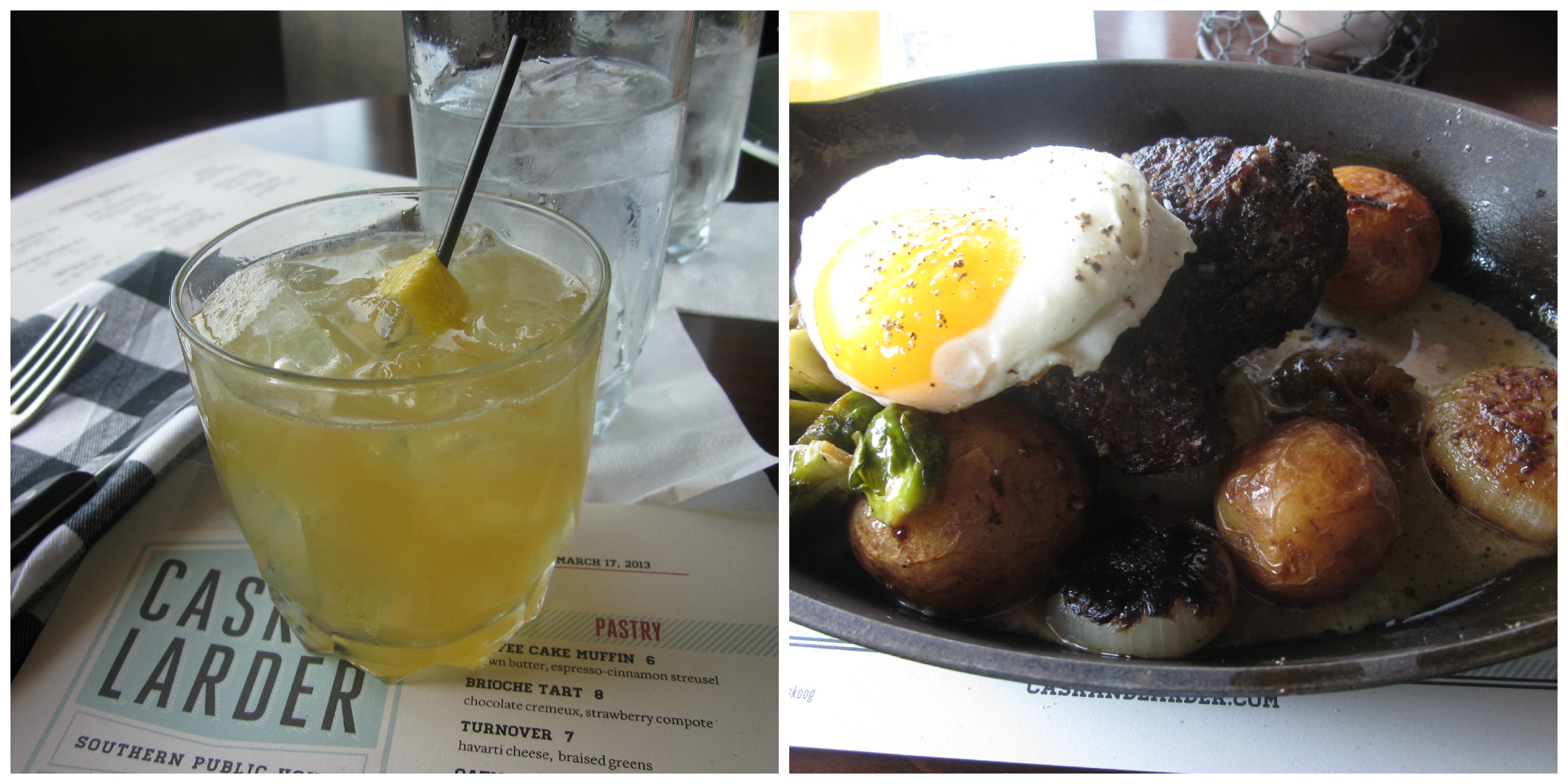 So, as the trip loomed with a 3AM wake up call on Monday we went out to brunch at Cask & Larder on Sunday after church for a final hand-crafted meal. We feasted. I, on a gin cocktail with fernet branca, lemon juice, and grapefruit bitters alongside a seven day cured pastrami with cipollini mushrooms, brussels sprouts and a fried egg. I have this new thing for bitters. They are so …bitter. The meat was amazing and the onions-meltingly sweet and tart with some kind of agro-dolce vinegar thing going on. He, on a blue corn tamale with scrambled eggs, skirt steak and chicharrones. Delightful way to relax and get ready for his upcoming adventure.