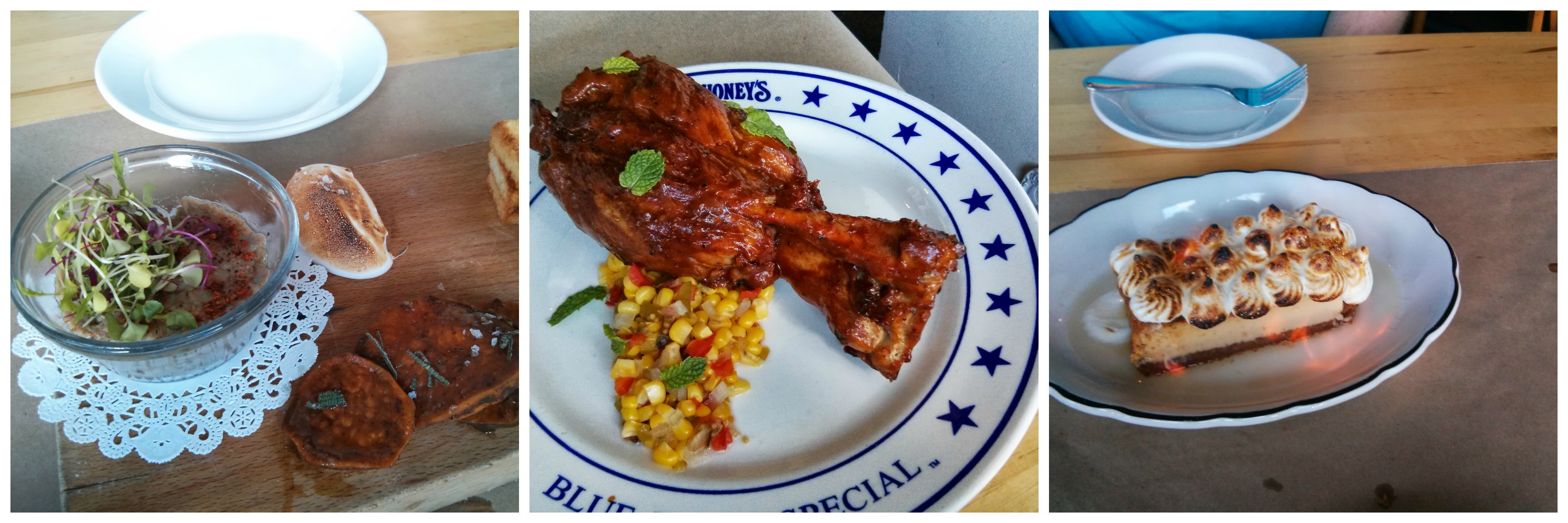 We walked in through outdoor seating and a small chef’s garden of herbs (someone was weeding and picking herbs through most of our dinner) and were fairly quickly seated. It is a small place and full-on eclectic with lots of found and folky objets and furnishings. The menu is really centered around the idea of sharing, holding both small shares (the more the merrier it says) and ‘big’uns’ and sides listed as complement’uns. We settles on a couple of small shares to start that includes Smoked Floribbean Fish Dip which was listed as ‘smoked daily catch, chives, lemon zest, potato chips. It was indeed a cool smoked fish salad that was topped with micro herbs and caviar ~so not quite as described but still tasty. I like the idea of smoked fish on salty chips. I don’t think it had the lemon zest and maybe would have benefitted for me with that bitter flavor although the micro herbs did give some of that. We also ordered Jar o’ Duck. This was a slow cooked (so melted) duck in a little glass ramekin-sad it wasn’t in a small jar actually. The accompaniments to this were interesting-toasted (read flamed!) marshmallow fluff, cold glazed cooked sweet potato and crisp (but cool) buttered toasts. I really enjoyed this dish. It was complex and interesting. The duck was rich and buttery and that was cut well by the sweet flavors of the marshmallow and sweet potatoes. For our mains we shared a BBQ’d Pork Shank that was served on some corn chow-chow and had fresh mint on top. The sauce was really good, not too spicy but really great when paired with that mint. The meat was falling apart and so savory. I usually say I don’t like mint, but really I think I do. This was a fresh unsweet mint and was great with that pork. On the side we had the most delicious brussels sprouts with molasses vinaigrette, sweet and sour apples and onions. My. Word. How did they achieve that? They were crispy and earthy and the vinegar of the vinaigrette just makes your mouth water. Which is so weird and yet so good. We finished with a flaming dessert. It wasn’t flamed in that throwback way but was a key lime pie covered in marshmallow and 151 rum that they set on fire at the table. I just love lime and that creamy bitterness of this was totally counterpointed by the burn on the rum and the sweetness of the marshmallow. It was just that good. I was overall pretty impressed by the food. One off point (besides that ridiculous parking) was the lack of a cocktail program. I’m don’t exactly live or die by it but I do enjoy a creative and complex cocktail hour and this was the type of dinner I would have thought could benefit from that. This meal was definitely worth the trip.