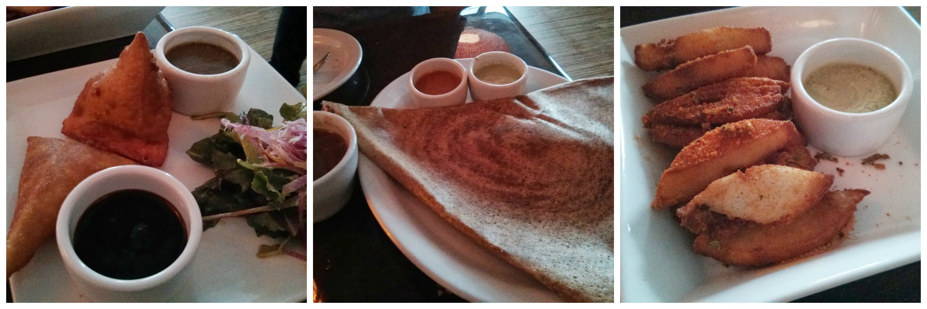 We decided to share small plates in order to taste the most flavors and I was so glad that we did. We started with crispy fish pakoras. The fish was sustainably caught, marinated in cumin, chile, ginger and garlic-then fried. It was served with a a hot chutney and a sweet onion chutney. Let me tell you something right now. The chutneys in South India’s cuisine are out of this world! Each one unique and amazing, full of flavor. You want to just keep dipping and eating them. They develop so much curiousity on your palate. Our next plate had two samosas, one ‘North’ and one ‘South’-one filled with vegetables and one with potatoes but the chutneys! Oh-one spicy with habaneros and one sweeter. The third small plate was full of idli with cilantro chutney. Idli are normally steamed cakes made of rice and black gram paste but these were more than that. Cut into slices and fried and then dusted with spices. I wanted to keep tasting them. We also had to have a dosa. A dosa is a huge crepe like pancake made of fermented lentils and stuffed. Ours was smeared with spicy basil, curry leaves, cashews, shallots, chile and ginger and filled with a mound of masala (spiced mashed potatoes). You eat it by breaking off a piece, dipping it in this delicious sambar (lentil dipping soup) and then into chutneys. Oh man. It was amazing. So much flavor. It was a really exciting meal. I am in love with this food and can’t wait to try it again and again!