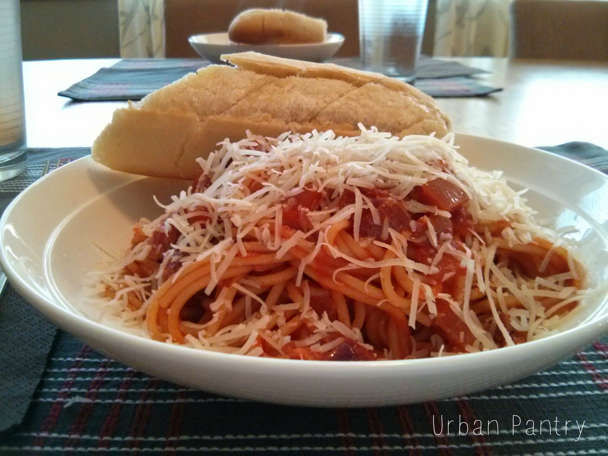 with full intentions of going out for dinner tonight and doing something fun for the evening we couldn’t get it together and ended up staying in. Z is off to pick up a movie now. He made dinner as well-one of my favorites. He first tried it when we were dating and we have made and tweaked it many times so that the recipe now is really to our liking. Bacony and spicy and warm it is a perfect pasta recipe where one recipe easily feeds six people, or two adults with a ton of leftovers! We also rarely eat seconds at dinner time-that’s just our thing. We do eat leftovers for lunch but throw out this attempt to keep it real.