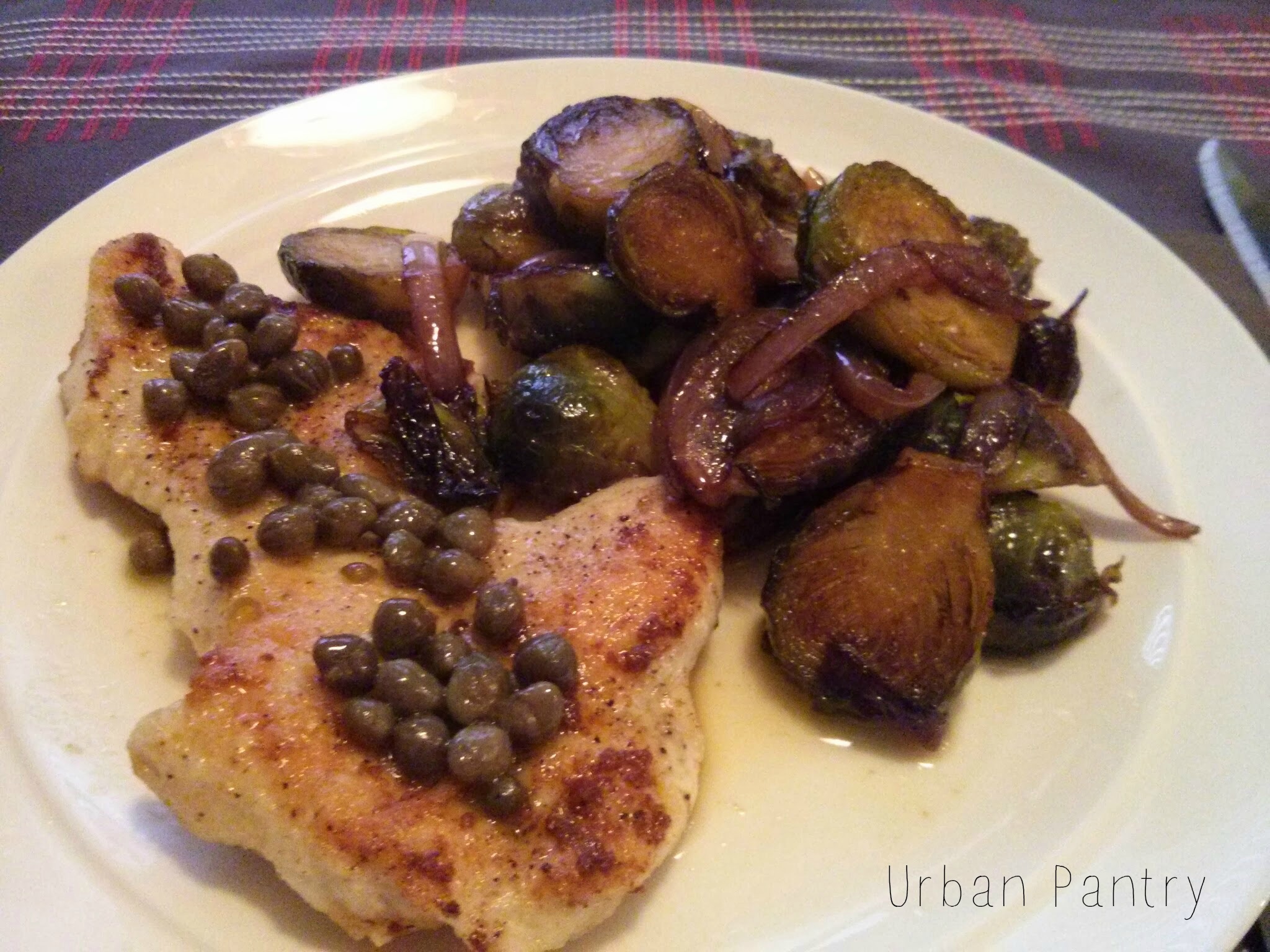 two recipes that probably shouldn’t be cooked for dinner in the same night-both with heavy hits of acid to either cut through richness or enhance natural sugars. It turned out to be an interesting thing to cook these two dishes together and eat them side by side. First, the chicken. I actually used a fish piccata recipe that I have often made by Melissa d’Arabian of the Food Network. It’s a simple recipe and I just subbed in pounded chicken fillets in place of the tilapia. The acid in this dish is lemon juice, quite a lot of it, alongside capers which are also brined. Everything becomes super savory with the addition of white wine and a knob of butter. For the side we had sort of agro-dolce Brussels sprouts. My friend Karin made some the other day and it made be want to eat some! She variously roasts them or uses them for an ice pack for her dog. She calls them veggie candy and in one of my favorite oldie but goodie recipes from Martha Stewart the sweetness of fresh brussels is enhanced with sauteed red onions and balsamic vinegar. If you leave them in and let them crispt a bit they are just phenomenal. I sort of combine step 2 and 3 so that everything gets crispy and melds together plus you don’t mess up an extra bowl. If you think you don’t like sprouts, try this recipe. It will change your mind.