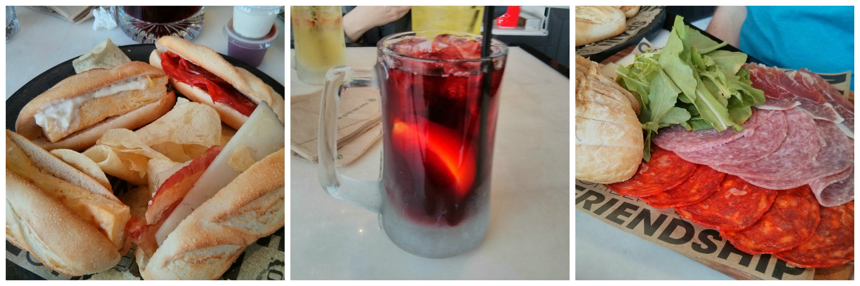 sometime over Christmas we went to see new Hobbit movie, The Desolation of Smaug. I liked it ok although the departure from the actual original story by JRR Tolkien was …vast. But, we saw it in Imax 3D (most spendiest tickets EVER and thankfully we had some old gift passes which saved us about $23 on the tickets!) and we really enjoyed it. On the way out of the theater we sidelined out of the theater to grab a coke for Z to take his pills and saw a new restaurant called 100 Montaditos. Actually, they kind of had a challenging logo and I didn’t know if it was SOO or 100 or what. Upon googling it I realized it was a new Spanish fast food chain in Orlando but borne in Spain. A franchise with locations mostly in Spain but quickly breaching into the US in Miami and other random locations north in New York and West in Iowa (?). I planted it on our Let’s Go! list and a friend at work saw it and said, ‘Hey, let’s go to the movies and lunch on Saturday-I really want to try that place.’ That sidebar is clearly working for me! So, we got up and saw Saving Mr. Banks and hit 100 Montaditos for lunch with him and another friend. Two movies in a week is a record for us-never happens. And a full confession: I haven’t seen Mary Poppins but I liked Saving Mr. Banks. What a great heart twisting story! After the movie we walked in and picked up menus. It could probably be overwhelming as there are 100 (as suggested in the name) options for montaditos. Montaditos are mini bocadillos which are one of my very favorite Spanish foods. Pan (Spanish bread) is split and stuffed with different tasty fillings. We each put in our order for montaditos and drinks and sat to wait. I had a classic Sangria which I watched them pour out of a bottle – I’d buy that if I ever saw it at the bottle shop. It had a big orange slice and was served over ice. At $3 it was worth it The montaditos themselves range from $1 to $3. They fairly quickly came out. I think it’s worth saying here that each sandwich is about 4 inches long. I think that people say to order 5 but I don’t see how anyone could really eat five. Maybe they could but the charm of it is I think if you really wanted more that you could order more. They are also served with a heap of potato chips on the plate so that is worth knowing. I ordered 4 with a side of papas bravas-fried potato wedges with two sauces, ali oli (garlic mayo) and brava (spicy red) sauce. They were hot and I liked them in the way I like most things made from potatoes. For my montaditos I had chorizo, tortilla, tortilla ali oli and Manchego cheese with bacon. Spanish Tortilla is basically omelet with potato and is my favorite bocadillo in general. I liked the one that had the addition of the garlic mayo too. I’d order that one again for sure. All four of my sandwiches were sold at $1 each- you can’t really beat that. Z also added a huge meat platter which could be a lunch unto it’s own – filled with chorizo, Serrano Ham, Manchego cheese and a loaf of pan and arugula. I tried a few of the meats on their own and they were all your standard Spanish cured meats and cheeses-tasty and salty. I really enjoyed 100 Montaditos as a lunch or tapas option. It sure reminded me of Spain and time I have spent there. I am sure we will be going back.