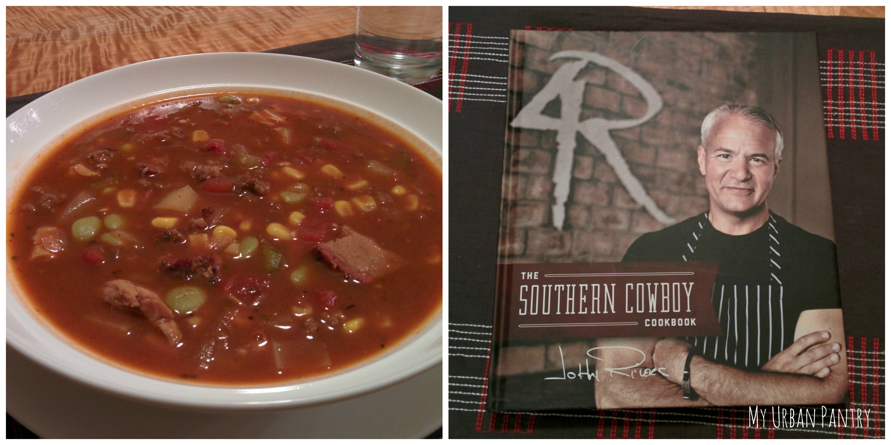 He’s even opening a new chicken joint soon that I am more than excited about.  So, in this quest to try new things and open my books I made a Brunswick stew recipe out of the book.  I probably could have put thirty seconds of thought into it and realized that it would feed a small army (which we are not.)  brunswickIt is a BBQ sauced soup that is full of brisket, chicken (it called for smoked, I used rotisserie) and sausage alongside those cowboy staples corn, diced potato and baby lima beans.  It made about 2 gallons.  I’ve eaten it three times, Z twice and our lunchmates  (X3) ate it today too.  That’s eight servings and I estimate 6 or 8 left in the fridge.   It is pretty dang good though, on cornbread (so I heard today at lunch) or with buttered yeasty rolls (my personal favorite.)  The picture here is rather soupy.  Only the first two bowls were soupy like that.  The rest is fairly just spoonfuls of meat and vegetables in the savory sauce.  I happily had a bottle of 4R hot on hand when I was cooking.  The rest of the book beckons…  I may just have to buy a smoker.
