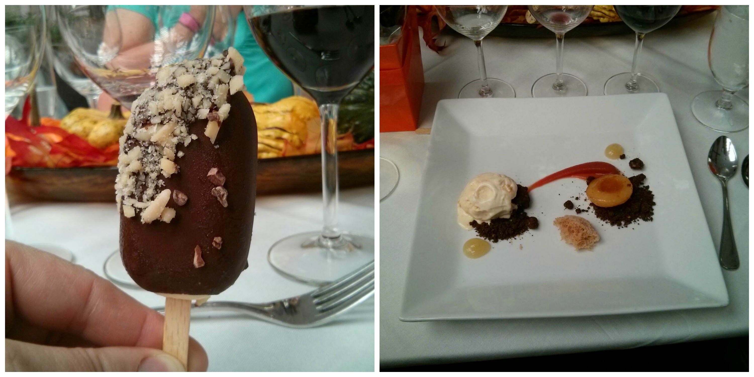 The second course was done by Bryan and was roast chicken. As they prepped and discussed this course Michael worked as hard as he could to push his brothers buttons. Messing around putting the obviously not ‘just cooked’ chicken on his face – they discussed poking a lemon up the butt (their words) of the chicken so that it doesn’t dry out and is full of more aromatics. He showed how to make a pumpernickel topped creamed spinach and gave a brief lesson on smoking guns as he discussed the grits (smoky cheesy) under the chicken. He talked a little about pan gravy from the juices and generally gave tips about his course and how the smokey Cabernet Franc wine would be a good match for it.