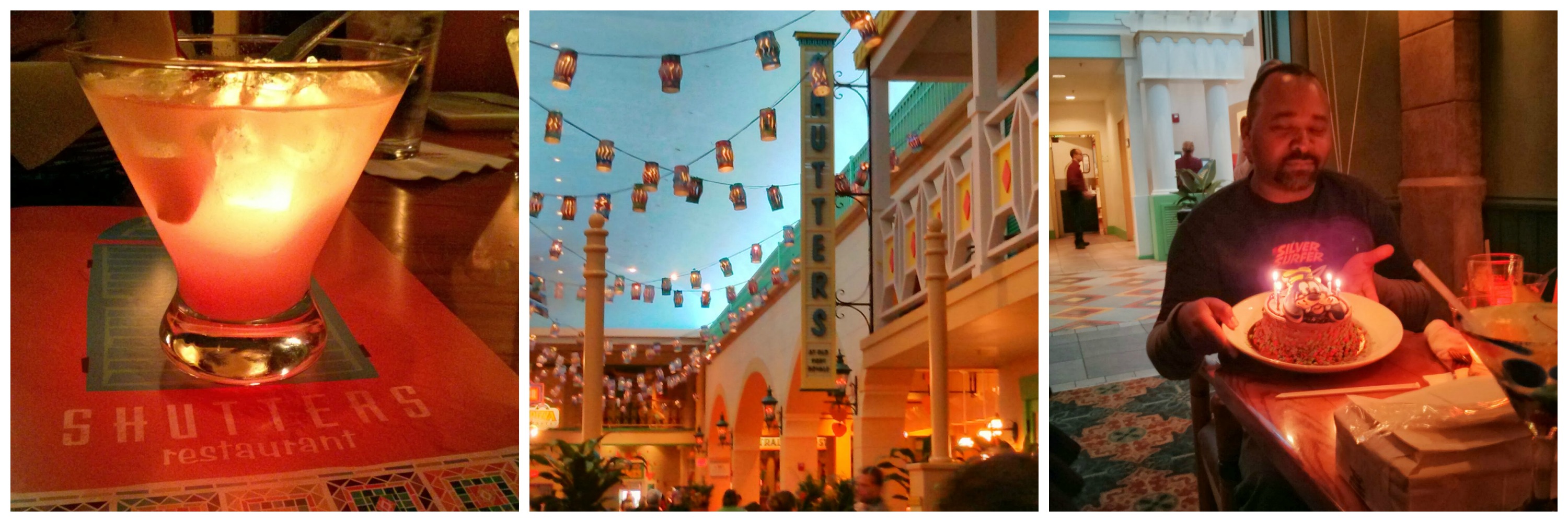 We went out for a surprise (although not for the birthday boy) birthday dinner last weekend. Our friend set up his own party and invited us out to dinner but didn’t say where we were going. He got some good joy out of making me stew and making the surprise be on us. Knowing how I google menus and pre-think restaurants he would randomly dangle the carrot throughout the week, asking if I was nerved up not knowing where we were going. I lived through it, barely. As it turned out we ate a a table service restaurant at the Disney Caribbean Beach Resort called Shutters. They said that it was island style food but we didn’t get that too much. There were a few nods to that culture-boat drinks (mine had a magical light up ice cube that gave me endless joy) and shrimp with plantains and some meat pie style empanadas. But oddly, no jerk and not much in the way of spices. Although there were some kicken spicy sweet chicken wings. I had some mahi tacos with mango salsa, all of which I enjoyed. The salsa didn’t have heat but a tasty sweetness and there was crunchy cabbage slaw. Z had steak with chimichurri with some type of boniato puree-more South American than island-inspired but it was flavorful and similar to tacos he really likes during Food & Wine. Our party was loud and full of laughter. We had fun hanging out with friends and meeting and getting to know some new folks. After our dinner they brought out a big goofy-cookie and Disneyfied cake for the table. Fun times!
