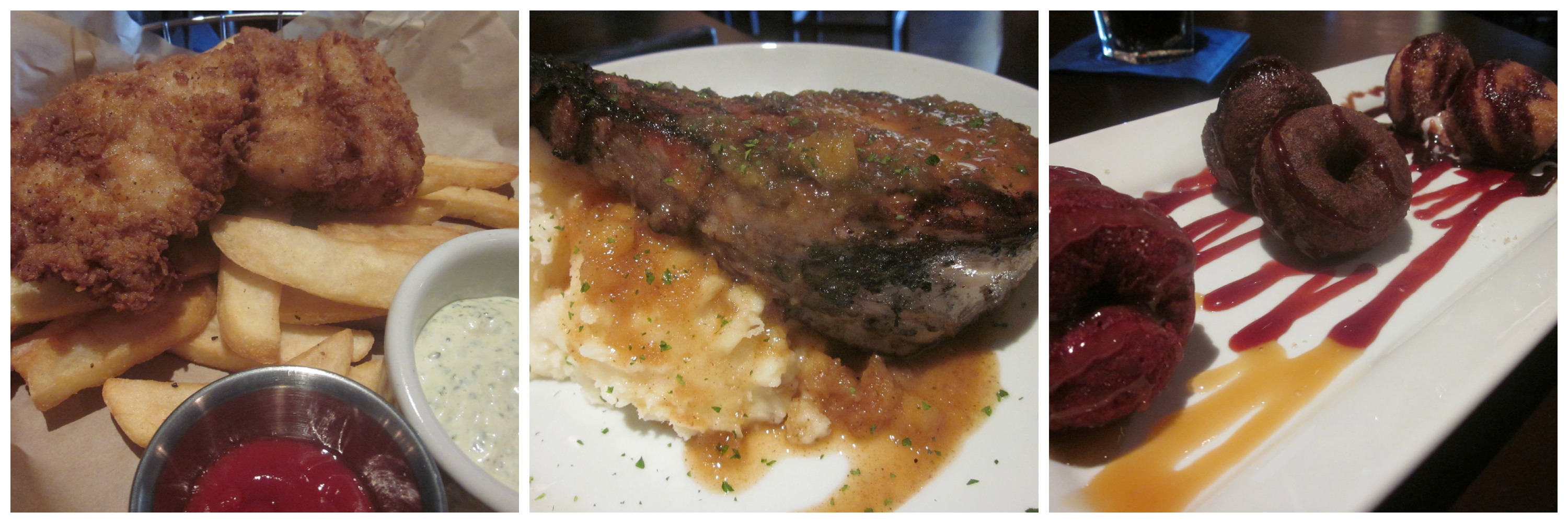It is full of warm wood, has a robust bar concept and is full of the golf shirt set. We sat in a tall backed circular booth and had a fair view of the room as we perused the menu. It was pretty busy with lots of post-work and post-golf schmoozing happening in front of our eyes. I went sort of traditional choosing fish and chips and Z had a pork chop. The fish and chips were solid. Two nicely sized chunks of white fish with a crunchy coating and steak fries. I really liked the tartar sauce a lot. It was really dilly and I didn’t think I liked dill. I might though. I wasn’t sure the server had been serving long as when I asked for malt vinegar she seemed surprised. I also had a little trouble eating it as it is served in a wire basket and it was a little greasy so I wanted to use a fork and knife and the wires of the basket posed a less that perfect backdrop for use of cutlery but it tasted really good. Z ordered a pork chop. It came out no less than three inches thick. Peculiarly, it was cooked through but not hot at all. I wanted to send it back but he wouldn’t do it. He said it tasted good with it’s accompanying mashed potatoes and apple chutney. We weren’t really hungry but they had a trio of doughnuts as a dessert offering so we tried that too. It was kind of funny really and unexpected, six mini doughnuts that were incredibly reminiscent of the ones you get in a gas station six pack. Surprising and bizarre-they were warmed and served with sweet sauces of chocolate, strawberry and caramel.